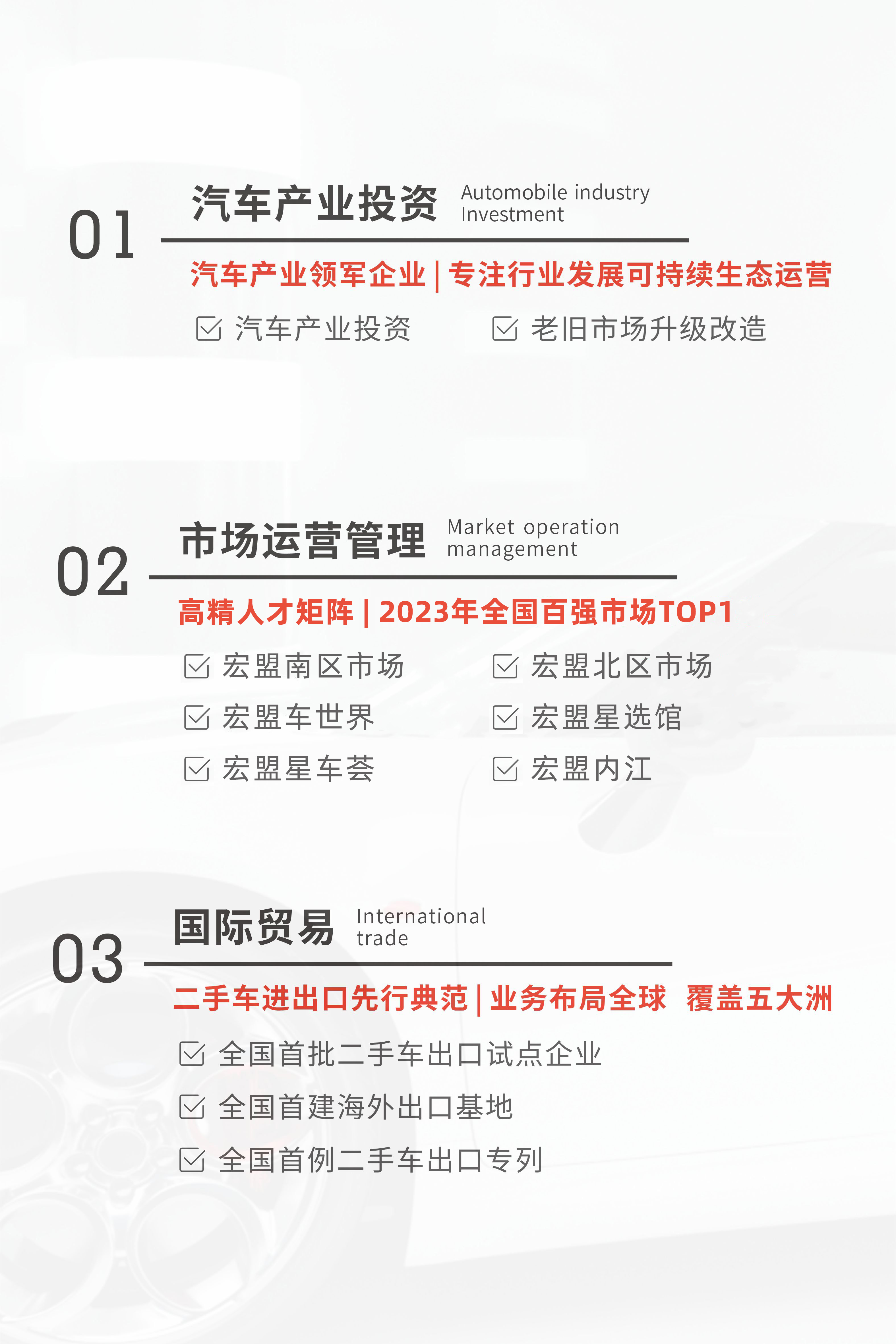 宏盟二手车交易市场驻场商户超800余家,展车规模12000余辆,涵盖奢华档、高中低档海量车型,场内配套检测、金 融、车管、进出口、后市场等全产业链服务。